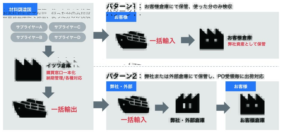 品質課題発生時の調査・代替品の手配や、お客様の倉庫・自社倉庫・外部倉庫でのVMI取引(在庫運用サービス)・JIT対応、危険品取扱や特殊梱包も好評です。大手メーカー様への豊富な実績と創業当時から培ったノウハウで、お客様のご要望に応えます。
