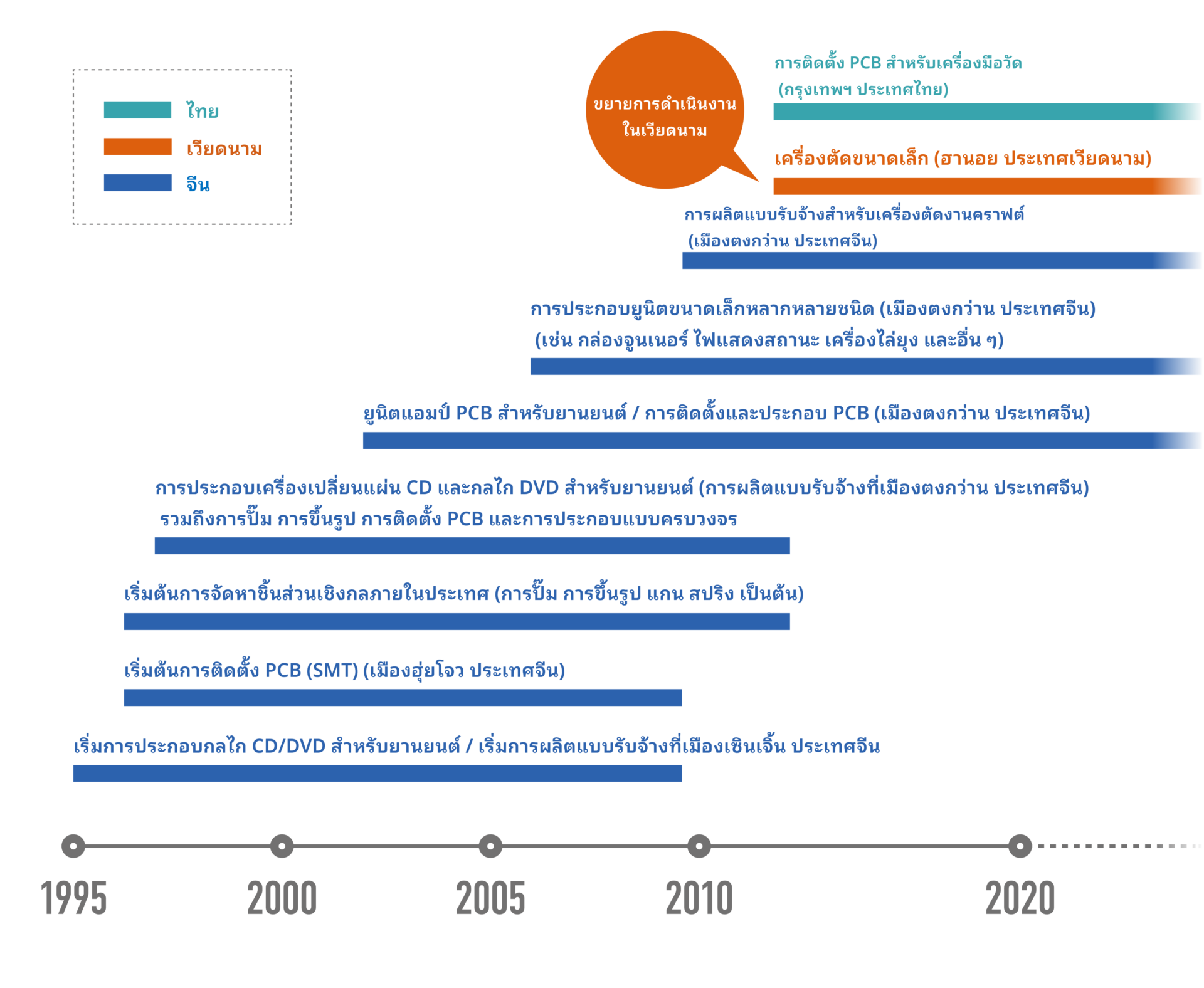 ในธุรกิจ EMS เรารับผลิตอุปกรณ์อิเล็กทรอนิกส์ตามสัญญาเพื่อตอบสนองความต้องการของลูกค้า เราดำเนินธุรกิจ EMS ในประเทศจีนมานานกว่า 20 ปี และในช่วงไม่กี่ปีที่ผ่านมาได้ขยายกิจการไปยังเวียดนาม พร้อมแผนจะขยายกิจการไปยังประเทศอื่นๆ ในเอเชียตะวันออกเฉียงใต้ในอนาคต