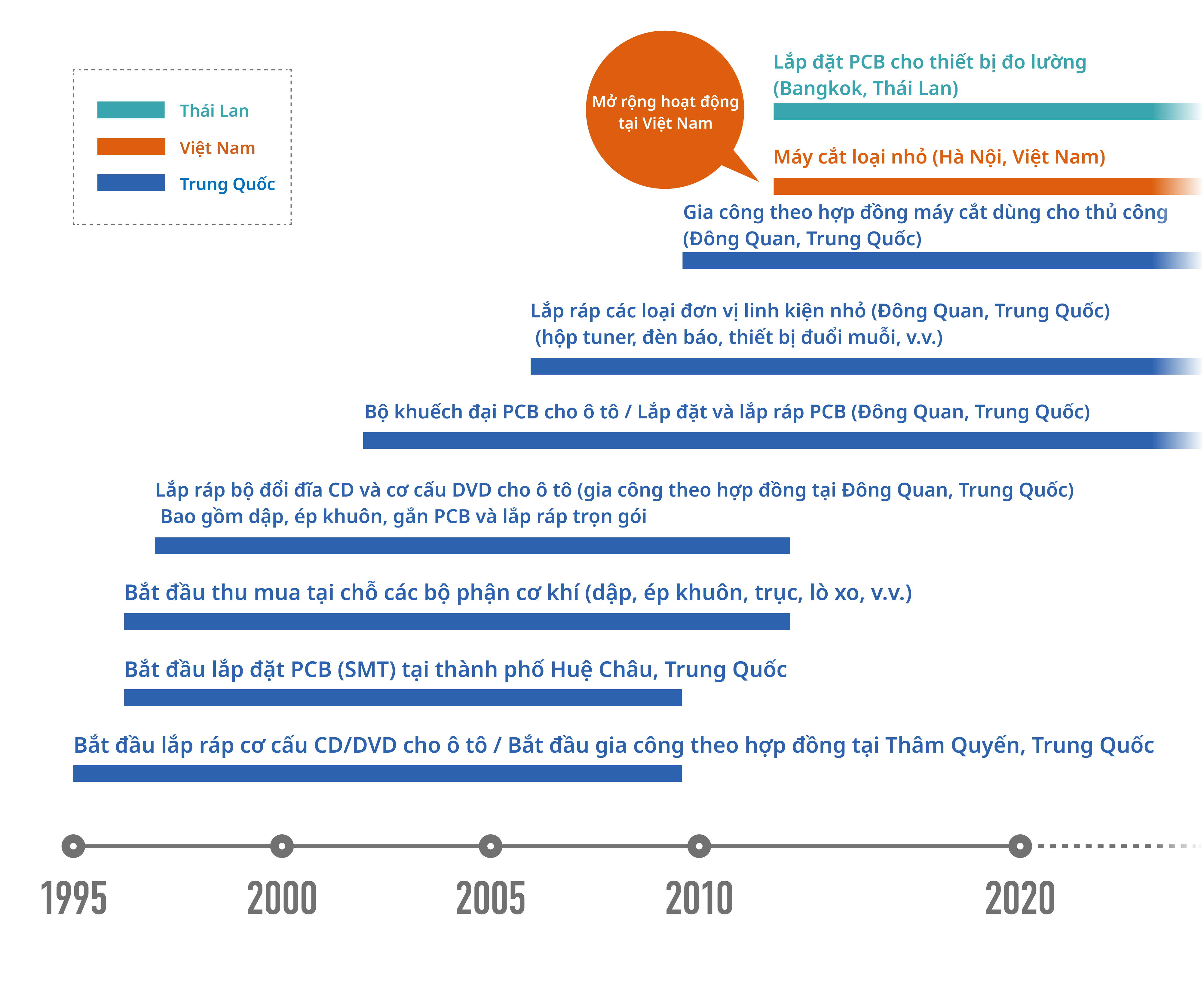 Trong lĩnh vực kinh doanh EMS, chúng tôi thực hiện dịch vụ sản xuất thiết bị điện tử theo hợp đồng nhằm đáp ứng nhu cầu của khách hàng. Chúng tôi đã triển khai hoạt động EMS tại Trung Quốc hơn 20 năm và gần đây đã mở rộng sang thị trường Việt Nam. Trong tương lai, chúng tôi đang xem xét việc mở rộng sang các quốc gia Đông Nam Á khác.